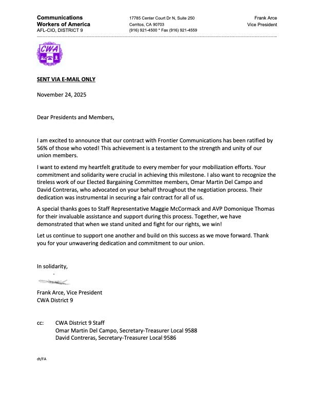 Hello Frontier CWA Members: