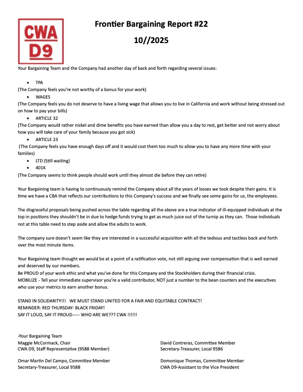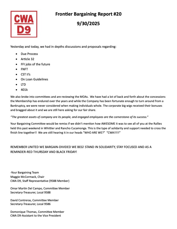 We are pleased to share with you the latest classes covered by our CWA negotiated Frontier Tuition Assistance program offered by UMass Global. These cutting-edge classes are fully covered by your annual benefit with no out-of-pocket expense … Read the rest “Frontier October 2025 UMass Classes”