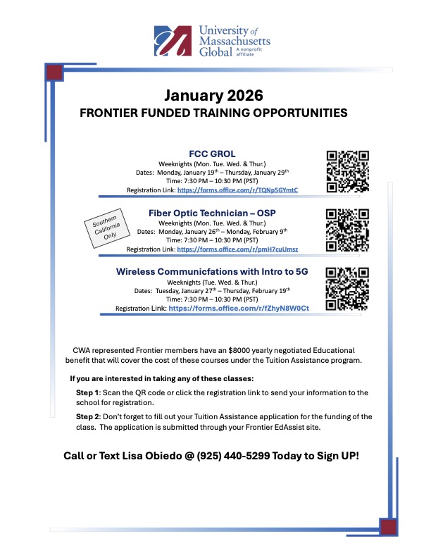 CWA works hard to secure benefits like Frontier Tuition Assistance for our members and we encourage you to take full advantage of the opportunity.