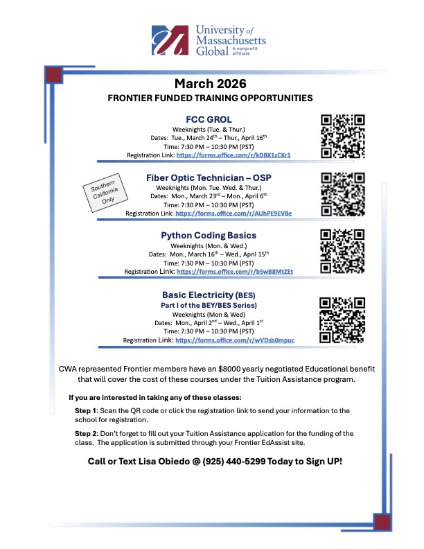 CWA works hard to secure benefits like Frontier Tuition Assistance for our members and we encourage you to take full advantage of the opportunity.