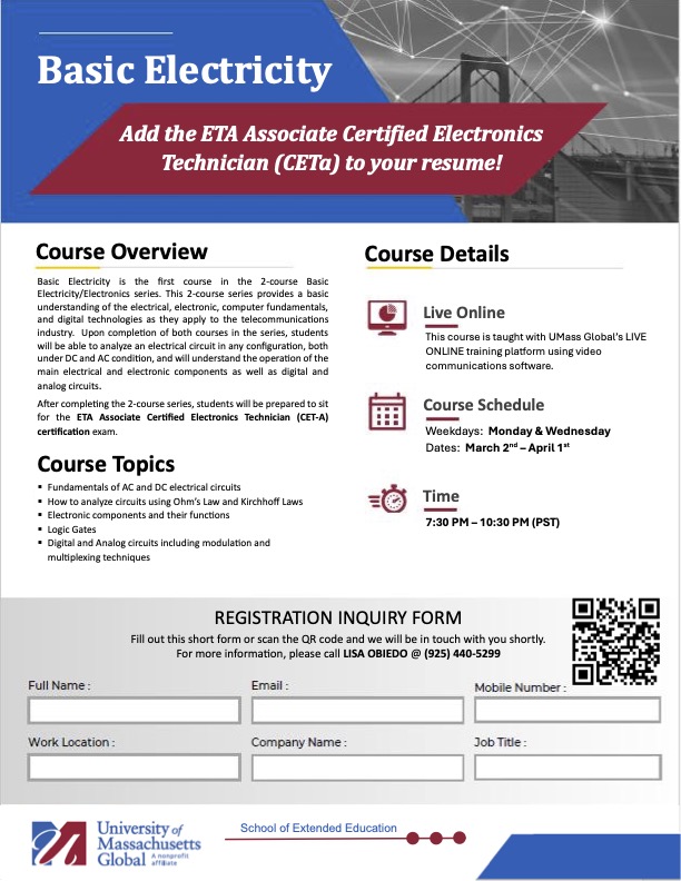 We are pleased to share with you the latest classes covered by our CWA negotiated Frontier Tuition Assistance program offered by UMass Global. These cutting-edge classes are fully covered by your annual benefit with no out-of-pocket expense to you. They each have the flexibility you need to learn from home through an innovative, live-streaming platform. All classes are LIVE ONLINE with expert instructors using UMass Global’s Adobe Connect Pro platform. And in case you miss a session, all class sessions will be recorded and can be watched at your convenience.