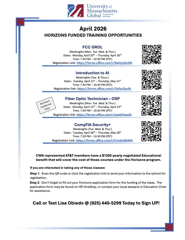 We are pleased to share with you the latest classes covered by our CWA negotiated Horizons program offered by UMass Global. These cutting-edge classes are fully covered by your annual benefit with no out-of-pocket expense to you. They each have the flexibility you need to learn from home through an innovative, live-streaming platform. All classes are held LIVE ONLINE with expert instructors using UMass Global’s Adobe Connect Pro platform. And in case you miss a session, all class sessions will be recorded and can be watched at your convenience.